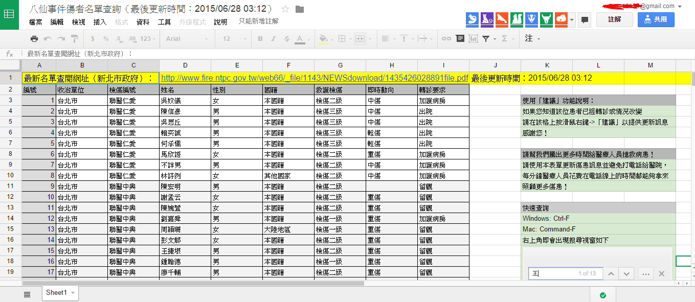 | 鄉民自製傷患名單google表格,共同編輯即時更新 |