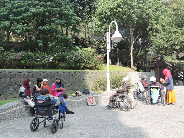 ▲Riwayati平常會和同社區印尼看護,推著被看護者到社區旁的白雲公園散步。