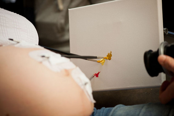 胎動不只是寶寶展現活力的表現,也是母子之間親密的溝通。六位比利時的孕婦把畫筆固定在肚子上,一旁放著白色畫布,等孩子在子宮內翻身、伸手、踢腿,當畫筆因胎動來回擺動,色彩豐富的圖像便躍然紙上。
