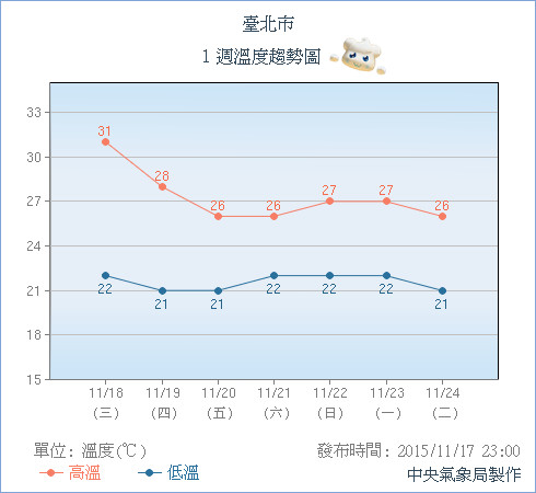 天氣風險公司也預估,18日秋老虎持續發威全台晴朗高溫上探31度,「一點都不像11月」,除了早晚較涼其他時間都是熱烘烘;19日起東北季風增強,北部東北部氣溫將下滑略為轉涼,伴隨一點零星短暫雨,但冷空氣強度不強,高溫仍有27度左右,中南部地區也有30度的高溫,未來一周氣溫持續偏暖,要真正有感覺較「冷」的冷空氣南下,恐怕要等到月底。