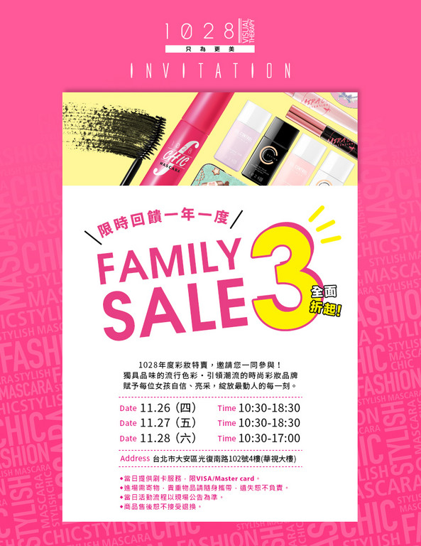 年末不僅是週年慶搶便宜的季節,很多品牌的特賣會也紛紛展開,折扣更是下殺更多!開架彩妝品牌1028也即將在11月26日至28日舉辦特賣會活動,包含多款彩妝、保養等單品,全面3折起,彩妝工具、彩妝品、洗卸品、面膜…等超值價50元起,現場也將加碼贈送滿額禮。