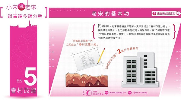 軍宅案近來鬧得沸沸揚揚,讓外界開始關注軍宅、眷村改建等議題,親民黨總統候選人宋楚瑜15日在臉書「圖解」眷改,指出當年任省長時,4年當中就改建2萬多戶,當時甚至還沒有眷改條例,且沒有花政府一毛錢;他強調,從政者掌握權力,「是要營造公平正義的社會,不能趁人之危」,領導人的價值觀,就要讓人民能夠信任才對。