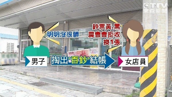 監視器畫面可以看到這名林先生拿著百元紙鈔,丟在桌上後,和便利商店的店員拿回另一張百鈔,看起來不是很開心,因為不滿店家竟然拒收這張百元鈔,林男說,「這張百鈔明明可以分辨滿清楚,超商店員竟然說太髒不收。」整件事發生在17日早上10點半,他到新城鄉某超商消費,拿100元要結帳,店員卻說,「鈔票有點黃黑,農會可能會拒收,請換一張。」