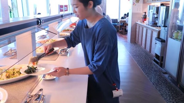 影片中,首先看到的是採光很充足的室內設計,員工餐廳擺設如同大飯店一般,所有食物都採自助式,一眼望過去,有冷盤區、熟食區、現打果汁吧,以及飲料區;用餐區則是靠窗邊,往外一看,台北市整個盡收眼底。