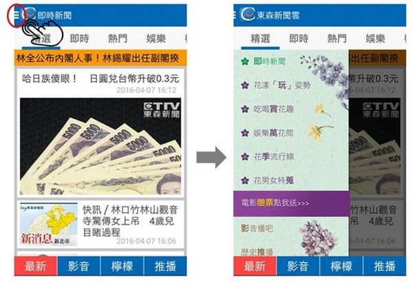 開啟《東森新聞雲APP》,點選左上角摺疊選單入口(四條橫線),即可展開側欄;立馬點選「電影贈票點我送>>」,填留資料、索取電影票衝衝衝!