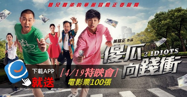 100張「傻瓜向錢衝」電影特映票大放送!浩角翔起陪你一起「向錢衝」!好康不怕你拿!只怕你錯過啊~現在只要下載《東森新聞雲APP》( 點我下載 APP ) ,即可獲得電影「傻瓜向錢衝」4/19(二)電影特映卷兩張!每人限領一份,共100張電影票,數量有限、送完為止!