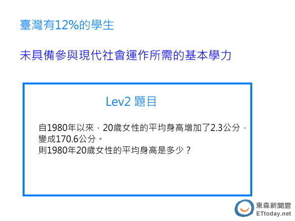 許添明表示,2012年的的PISA研究顯示,我國15歲學生當中,就有12%並未通過測驗的level 2等級。他舉例「自1980年以來,20歲女性平均身高增加了2.3公分,變成170.6公分,則1980年20歲女性的平均身高是多少?」這道題目若以200萬學生的12%來計算,就有超過20萬名學生答題失敗。導致的原因他分析有可能是學生看不懂題目,因此而答錯。
