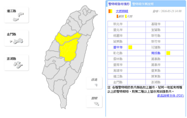 氣象局也於23日14時29分發布大雷雨即時訊息,地區為台中(東區、北屯區、豐原區、東勢區、潭子區、新社區、霧峰區、太平區、大里區 )及南投( 草屯鎮、國姓鄉),時間持續至15時00分止。