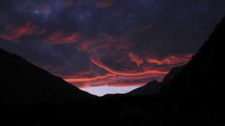 這段影片是1日19時許在太魯閣台地的奇特雲彩,從畫面中可見,天空好像染上一層層又紫又紅的雲海,襯托了山的壯闊,層層堆疊的雲海也讓人驚奇。許多網友看完後,直呼「美」、「很美,但有點怕怕的感覺」、「有惡魔要降臨了嗎?」、「好奇特的奇景」。
