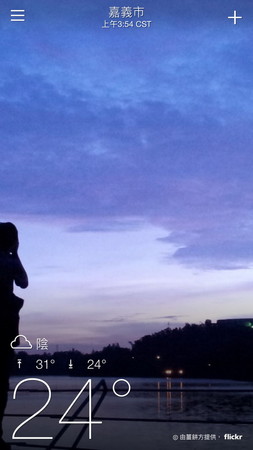 「Yahoo氣象」採用flickr照片當背景,配合打雷或是下雨等動畫特效,由下往上滑可以拉出半透明、疊在背景圖上的天氣資訊,使用起來相當好上手。「Yahoo氣象」新增地點方式也很有彈性,不管是輸入郵遞區號或是地名都可以,且不必輸入全名,只要輸入頭幾個字母,就會自動把符合的城市列出來了。
