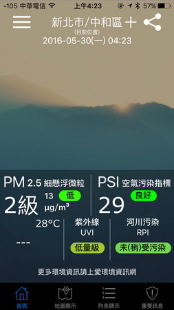 現代人除了要面對「晴時多雲偶陣雨」陰晴不定的天氣,更令人煩惱的是眼睛看不見的危險,例如PM2.5細懸浮微粒、空氣污染、紫外線等威脅,能在出門前瞭解這些肉眼看不見的危險指數,可以事先採取一些預防措施,降低傷害。「環境即時通」就是由環保署所推出,提供第一手的環境監測數據給民眾參考。