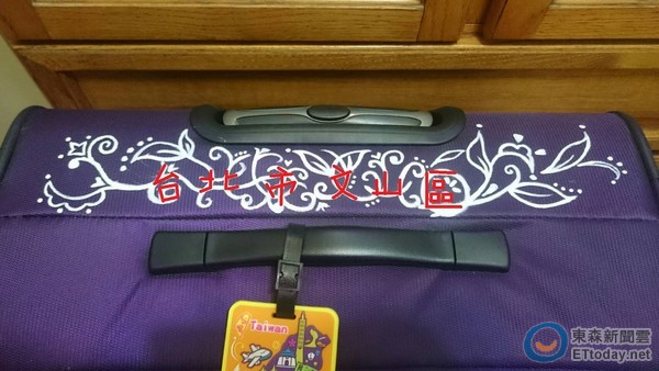 ▲新買的行李箱被媽媽寫上「台北市文山區」了!(圖/網友電冰箱授權提供,請勿隨意翻拍,以免侵權)