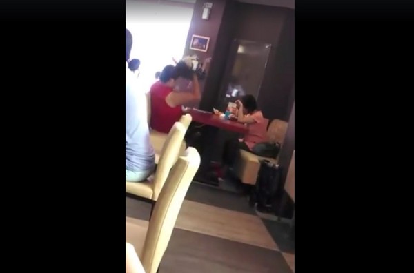 期間,小孩一直吵吵鬧鬧爬上爬下,就在網友要拍下這對父母的行為時,「他們家女兒不知道做錯了什麼,突然間被爸爸過肩摔到桌上(嗯...過肩摔是有誇張了點),然後一手推到對面,摔落在椅子上,再來媽媽多補了一句話,然後一巴就這樣給她巴下去」。