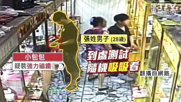 隔空取物?新北市蘆洲一家娃娃機業者日前發現商品短少,但顧客的消費額卻沒有增加,疑惑之下調閱監視器查看,赫見28歲的張男帶著全家大小走進店,還拿著強力磁鐵將3C產品「吸出來」,整個過程短短不到3秒鐘,爆氣痛斥「可惡!」立即報警逮人。