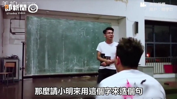 影片一開始,老師先強調,大家都知道「乳」這個字代表著「小」的意思,比如說「乳豬、乳牛」,代表的就是「小豬、小牛」;之後他便請小明上台,用「乳」這個字來造句子。小明上台後,天真地造出「我家很窮,只能住40坪的乳房」、「我每天上學都要經過我家門口的一條乳溝」,嚇得老師直冒冷汗,要小明再重新造句,結果小明說他想不出來,「想到都把他的乳頭給想破了」,讓人看完後無奈地笑了。