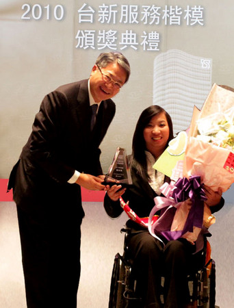 ▼義光育幼院傑出院友胡光秋(右)曾獲台新銀行「2010年度服務楷模獎」,由董事長吳東亮親自頒獎。(圖/記者張曼蘋攝/取自義光育幼院網站)