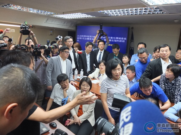 立法院衛環委員會上午將確認上次開會的議事錄,因此藍綠黨團一大早都發布甲動,雙方也再次共佔主席台,時代力量立委也加入戰局,立委們在主席台前僵持不下。