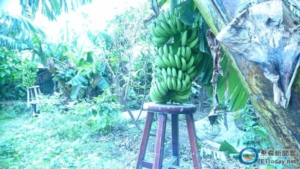 一般為維持香蕉長大結果,都會以木頭、竹子、鋼條或水泥柱支撐果樹,來防止颱風的吹倒受損,但這位楊姓農友非常有禮貌的請香蕉坐椅子,而且還一口氣墊了二張板凳,剛好能撐住香蕉果實的重量。