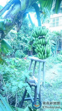 ▲並疊上2張板凳讓香蕉安穩坐到「在欉黃」(圖/記者楊熾興攝)