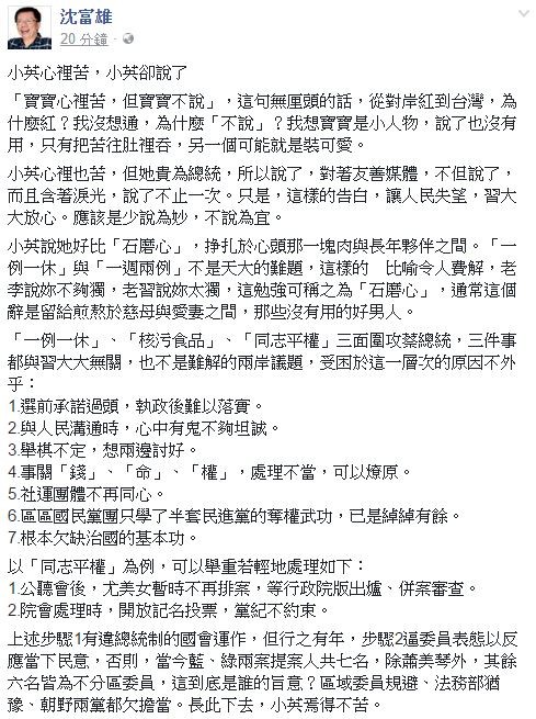 接著,沈富雄說,待立法院會處理時,再開放記名投票,黨紀不約束,「上述步驟1有違總統制的國會運作,但行之有年,步驟2逼委員表態以反應當下民意」,否則藍、綠兩方的提案人幾乎都是不分區委員,如果繼續處於區域委員規避、法務部猶豫、朝野兩黨都欠擔當的情況之下,「小英焉得不苦」。