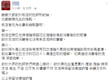 ▲八德路高級日本料理發聲明反駁。(圖/翻攝自臉書)