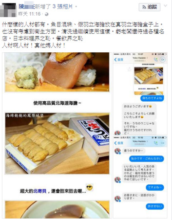 陳料理長還寫到,該高級日本料理店魚目混珠,將假羽立海膽放在真羽立海膽盒子上,如果盒子清洗過繼續使用,可能會有衛生上的問題,「虧老闆還待過各種名店。」並且將與日本店家的對話紀錄秀出,日本店家表示,「盒子是我們的,但是海膽不是」,陳料理長趕緊向對方道歉。