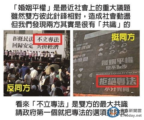 臉書粉絲團《小聖蚊的治國日記》13日貼出一張照片表示,「婚姻平權」是近來的熱門的議題,贊成和反對兩方互別苗頭,沒有要相讓的意思,不過在這其中,也發現了共識的地方,那就是反同方與挺同方抗議標語都有「不立專法」的訴求,所以「這應該是最大的共識了吧!」