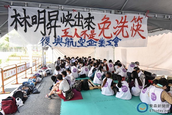 ▲圖為復興航空企業工會夜宿林明昇住處,要求董事長出面負責。(圖/記者李毓康攝)