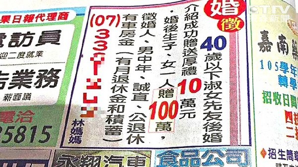 高雄市一名80歲老太太,因為51歲兒子一直未婚,心急的她在報紙刊登徵婚啟事,喊出「介紹成功紅包10萬元,媳婦婚後,生男生女各得100萬元」;老太太還說,兒子有車有房,存款千萬以上,歡迎40歲以下有興趣的女性打來詢問。但這樣的條件,婚友社媒人卻認為,在這樣的年代想找年紀差距大的女性結成連理,恐怕有些難度。