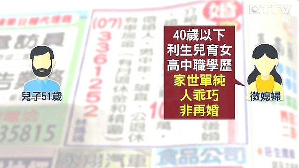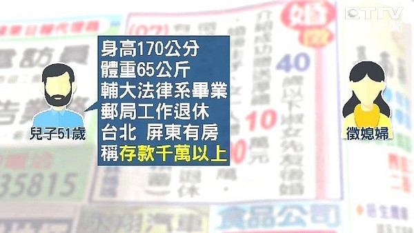 他說,兒子51歲,身高170公分,體重65公斤,法律系畢業,公務員退休,台北、屏東都有房子,存款千萬以上,想找40歲以下,能生兒育女、乖巧、單純、非再婚的媳婦。
