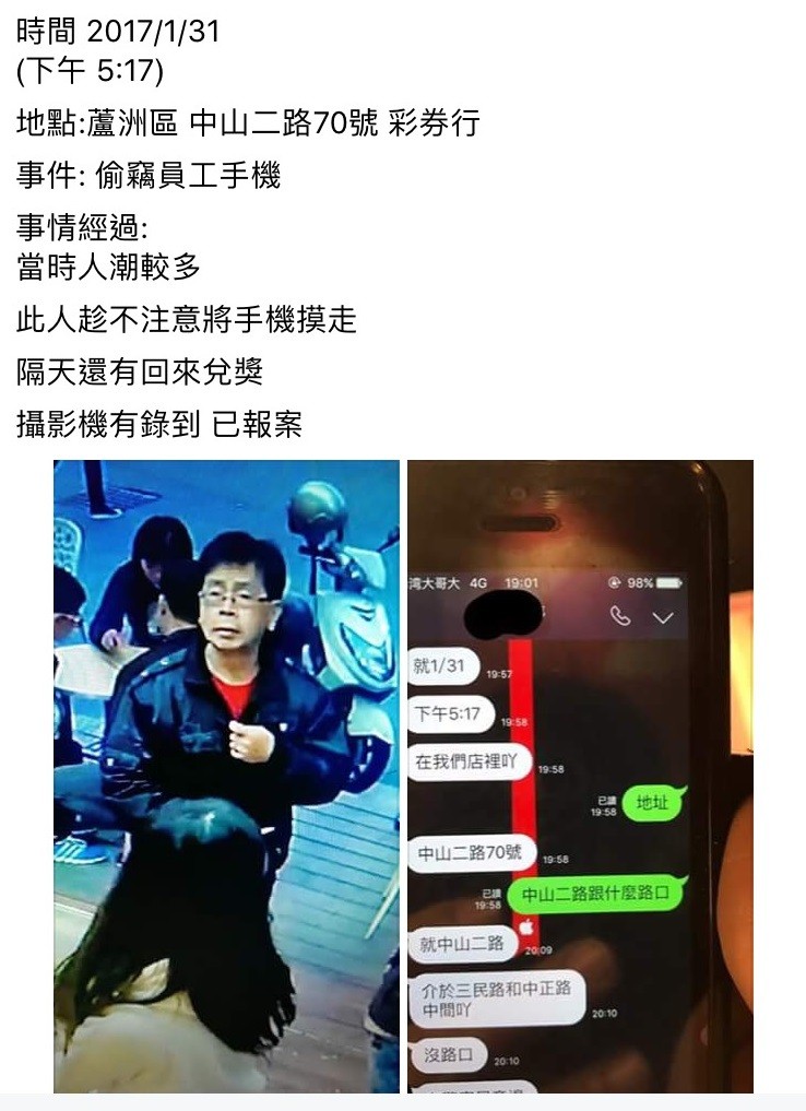 年初四偷手機!新北市蘆洲區一名年約40多歲男子,上月31日下午5時許跑到中山二路上某彩券行,趁著大家都在過年期間買彩卷及刮刮樂,人潮眾多,假借上門購買彩券,但其實早已鎖定店員擺放在桌上的iPhone6 Plus手機,並趁對方不注意時下手行竊。店員事後發現手機被偷,趕緊報警,警方也正循線查緝竊賊中。
