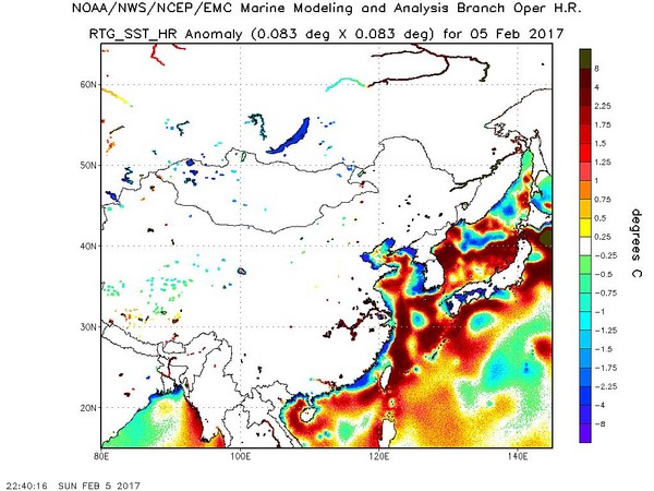 鄭明典則在臉書提到黑潮的溫差,從24小時內的海溫距平分析來看,「台灣東側現有黑潮通過,一直延伸到日本東西兩側, 這股暖洋流有利低壓在海陸交界處發展,低壓發展有利低壓西側的冷空氣南下。」不過冷空氣如果通過海面,溫暖的海溫又會使北風增暖, 所以,「到台灣的北風冷不冷,和低壓的位置有關,低壓的位置則和北太平洋是否有阻塞高壓有關。」