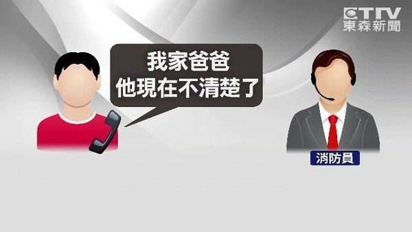 黃姓男童日前和爸爸一起洗澡,對方突然身體不適、四肢無力,癱坐在地上,他趕緊衝出來請其他家人幫忙,並打119求救,他告訴消防隊員,「我家爸爸他現在不清楚了,他現在就是醒著,甚麼事都不知道。」消防員回答,「先不要緊張,我們救護車現在過去了,你幫我看一下他有沒有呼吸心跳好不好?」他又回答,「爸爸走路斜一邊,不知道為什麼就突然不動了。」