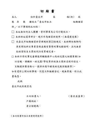教育局提出的切結書包括,私立短期補習班無任何法人團體、營利事業及公司行號設立,違建部分絕不作為補習班使用,而聘任教師均具有科目專業資格,並有警察局刑事紀錄證明無妨害性自主罪等,且班級不得從事兒童課後照顧服務。