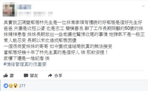 不少友人也留言表示同情說:「這種長期以來的精神壓力,真的很無奈,結局令人惋惜。」、「達崩潰程度了才會這樣,希望一切平安度過。」、「長期照顧病人真的不容易,況且他妹妹又是精神患者,照顧她的人長期下來的壓力,真的不是我們外人可以體會的。」