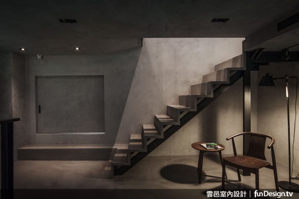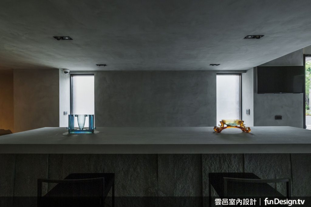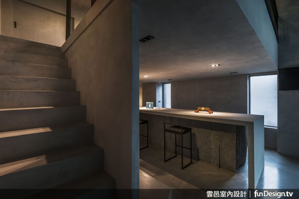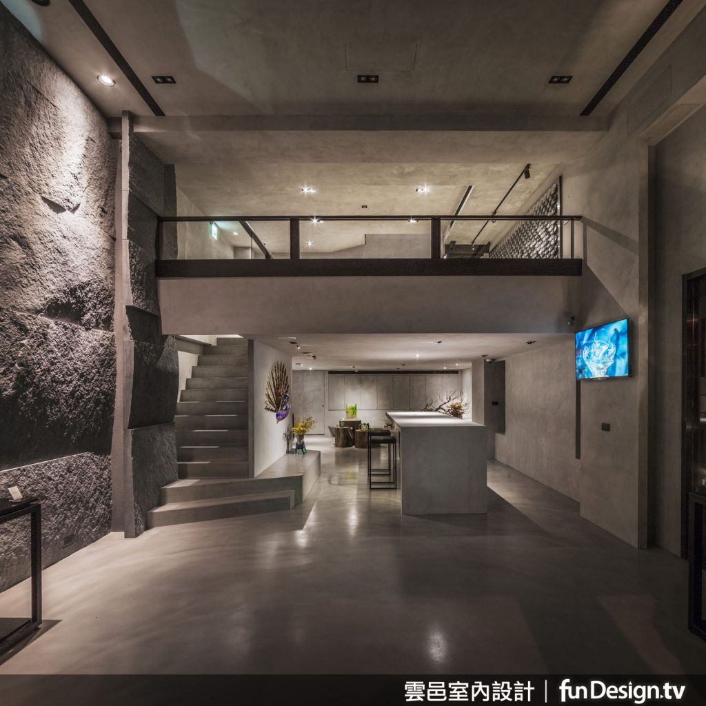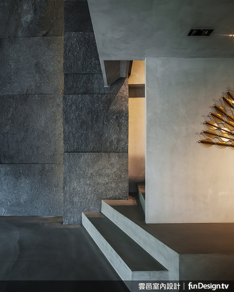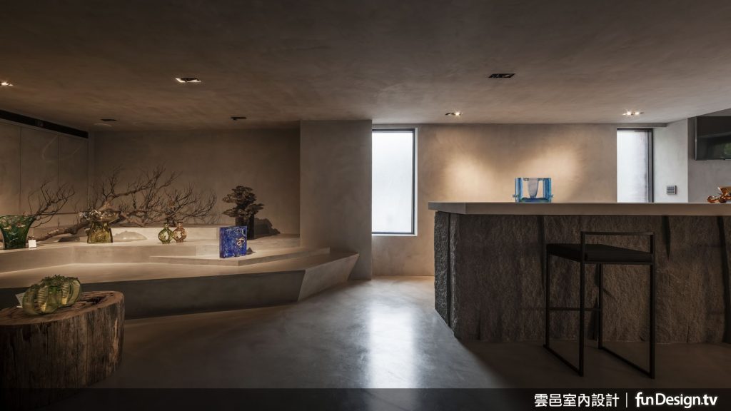 為回應每件產品獨特的藝術價值與獨到創意,從珪藻土、石皮、PANDOMO等材料相互連貫的紋理,皆俱寂共賞,以自然成就的空間狀態,承載當代藝術的創意所需。灰色的彩度由著天地壁相連的線面間取得和諧印象,脈絡相承且自成一格。