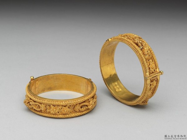 清 金纍絲花卉龍紋鐲二件。鐲面纍絲花卉、龍紋相間,上下邊緣飾繩紋。via