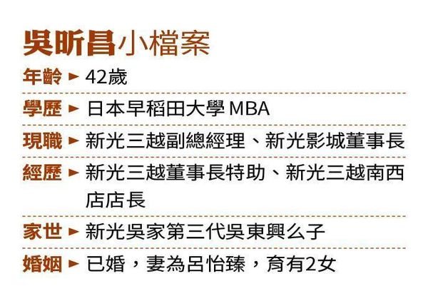 吳東興的3個兒子早已進入新光三越歷練,3兄弟各司其職,老大吳昕達個性霸氣,負責開發、商場規畫;老二吳昕陽長袖善舞,負責對外、掌管營運;老么吳昕昌是隨和的阿宅,負責數位、娛樂,近2年還扛起開發新光三越Outlet品牌的大任。