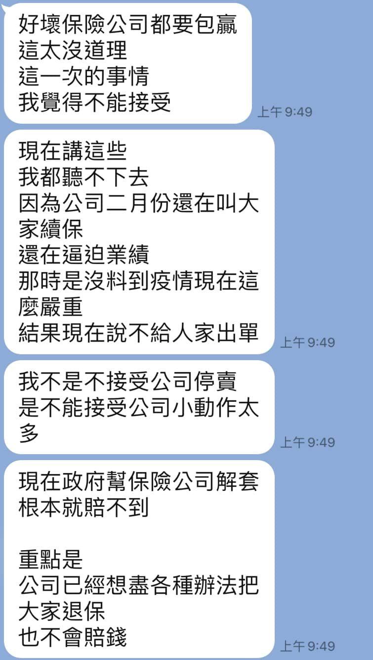 根據對話內容,保險業務員表示,公司二月份還在叫大家續保,還在逼迫業績,那時是沒料到疫情現在這麼嚴重,結果現在說不給人家出單,而現在政府幫保險公司解套,根本就賠不到,重點是公司還想盡各種辦法把大家退保,也不會賠錢。