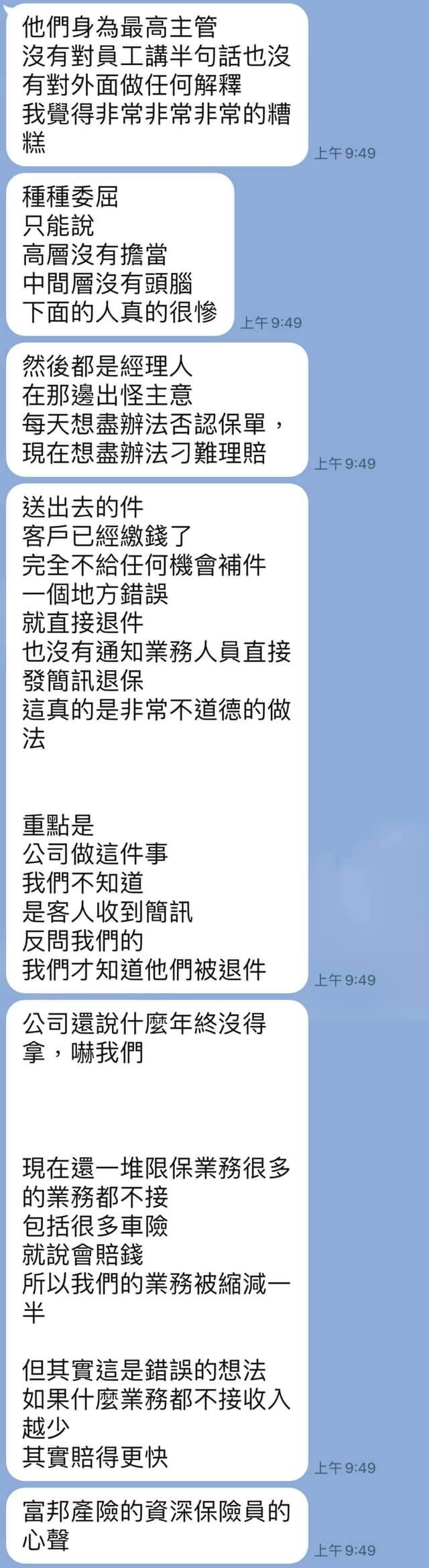 該名業務員說,送出去的件客戶都已經繳錢了,卻完全不給任何機會補件,一個地方錯誤就直接退件,也沒有通知業務人員直接發簡訊退保,「這真的是非常不道德的做法」,而且重點是,公司做這件事他們都不知道,是客人收到簡訊反問,他們才知道被退件。