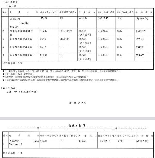 ▲柯志恩111年財產申報(不動產)。(圖/翻攝111年公職候選人財產申報資料上網公告,點圖放大)