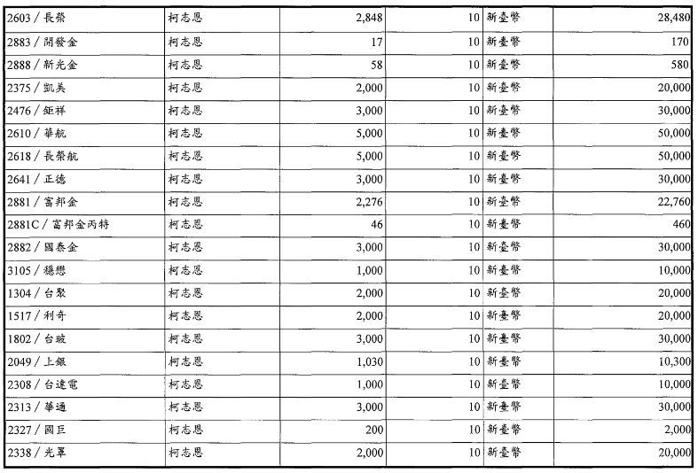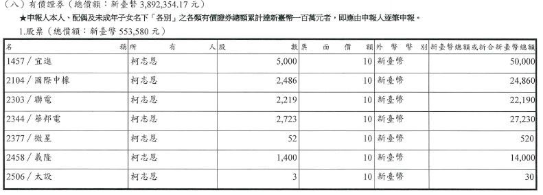 另外,有價證券部分,柯志恩名下共計27檔股票,總計55萬3580元。其中以華航、長榮航較多,兩檔航空股各5張,其次金融股有國泰金、富邦金等,各約2至3張,電子股則有聯電、華邦電、台達電等,各約1至2張。另有1筆債券49萬4650元,投資基金折合約307萬9274元,保險約576萬7360元。
