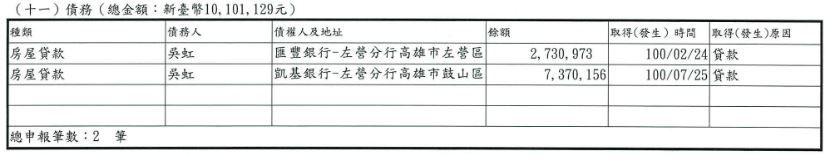 ▼陳其邁111年財產申報 (債務)。(圖/翻攝111年公職候選人財產申報資料上網公告,點圖放大)