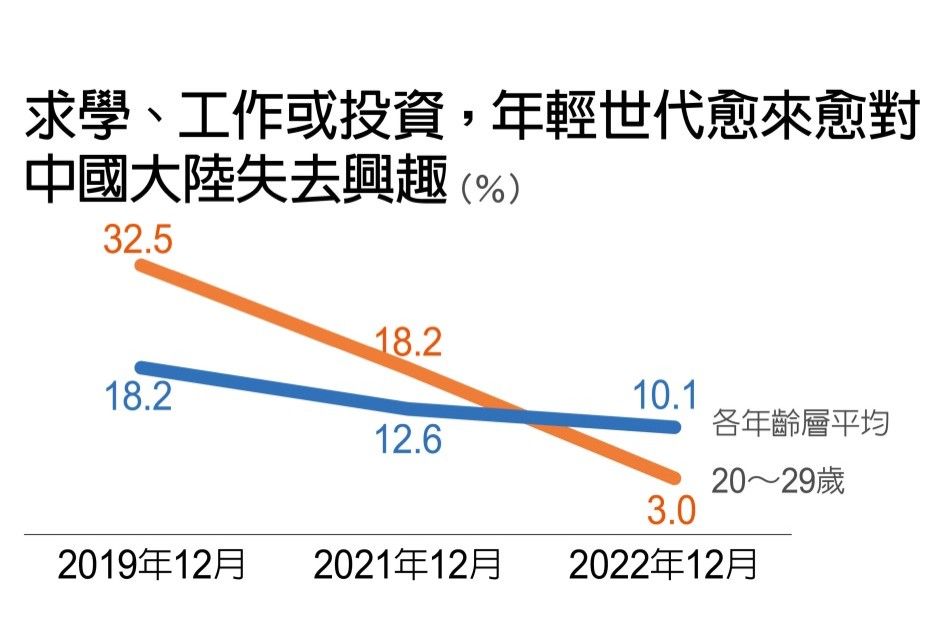 根據《遠見民意研究調查》21日公布「2023台灣民心動向大調查」結果顯示,台灣民眾對2023年經濟大勢並不樂觀,有43%認為2023年的國內經濟發展會變差,而兩岸緊張氛圍也連帶影響民眾赴陸意願,願意「西進」投資或就職求學的民眾僅剩10.1%,其中20至29歲有意願的民眾更剩下3%。
