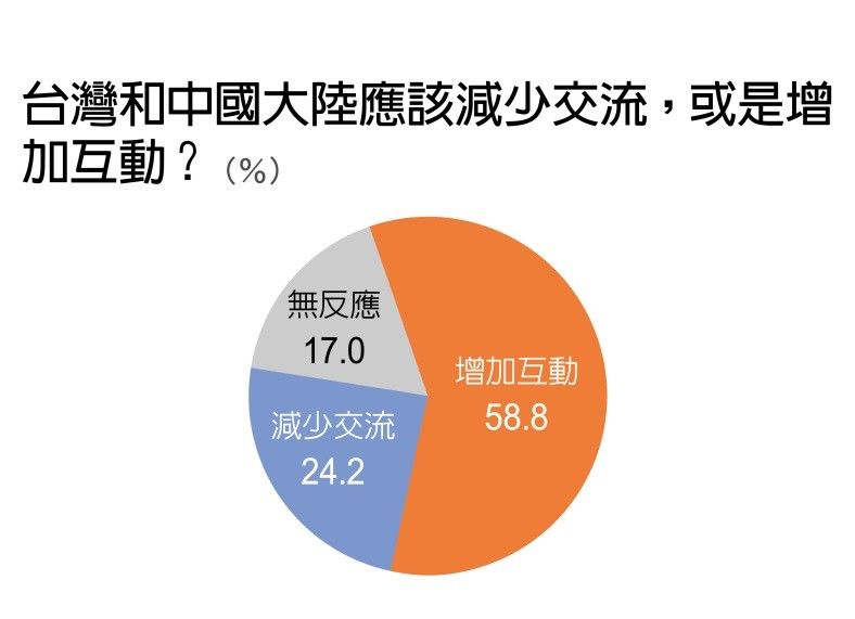 然而,遠見民意研究調查中心也強調,即便大多數的人都認為兩岸關係變不好,台灣民眾卻仍未放棄與對岸交流的機會,高達58.8%的民眾仍認為,兩岸應該增加互動,僅有24.2%主張減少。但相較去年同期,增加互動的比例降低1.3個百分點,減少互動的也減少2.7個百分點,民眾希望增加互動的比例也創下歷年新低。
