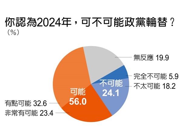 調查結果指出,有56%民眾認為2022年縣市長選舉結果恐讓2024年總統選舉再次發生政黨輪替,24.1%認為不可能。另外,有24.9%民眾認為自己立場泛藍,29.3%民眾認為自己政治立場泛綠,5.7%支持第三勢力的台灣民眾黨,自認立場中立的民眾高達40.2%,相較過去數據,泛藍支持者比例略微增加,泛綠則有下滑跡象,其中中立選民增加幅度最為顯著。