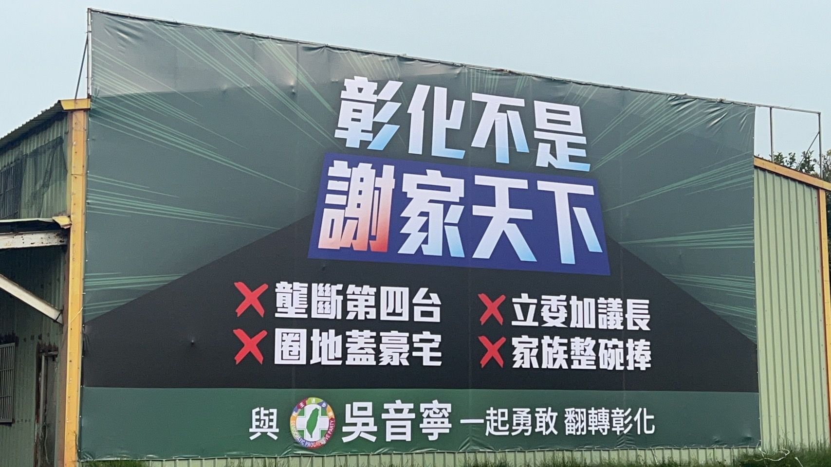 至於此次要挑戰國民黨彰化立委參選人謝依鳳的吳音寧,她的首面看板掛在二林鎮的斗苑路,「彰化不是謝家天下」的標題下,也直批謝衣鳳及其胞弟謝典林一個當立委一個當議長、家族整碗捧、壟斷第四台、圈地蓋,吳音寧也呼籲鄉親跟她一起勇敢翻轉彰化。