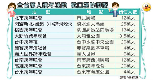 羅一鈞則提醒,年末聚餐及跨年活動參與人數眾多,今年已無嚴格防疫管制措施,如於人潮聚集且無法保持適當距離或通風不良之場所、與年長者或免疫低下者密切接觸時,建議戴上口罩保護自己與他人安全。台大醫院兒童感染科醫師黃立民建議,如果本身健康狀況沒那麼好,跨年大型聚集活動還是少參加,如果要前往,就要做好2大保險措施,分別是完成新冠XBB疫苗接種、戴好口罩。