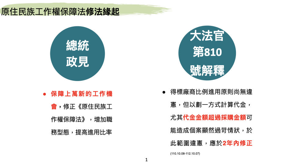 原民會透露,行政院今日通過原工權法部分條文修正草案,將送請立法院審議,,為實現總統蔡英文保障原住民族工作機會的政策主張,並回應司法院釋字第810號解釋意旨,期望在保障原住民族工作權及法律合憲性之間取得平衡。