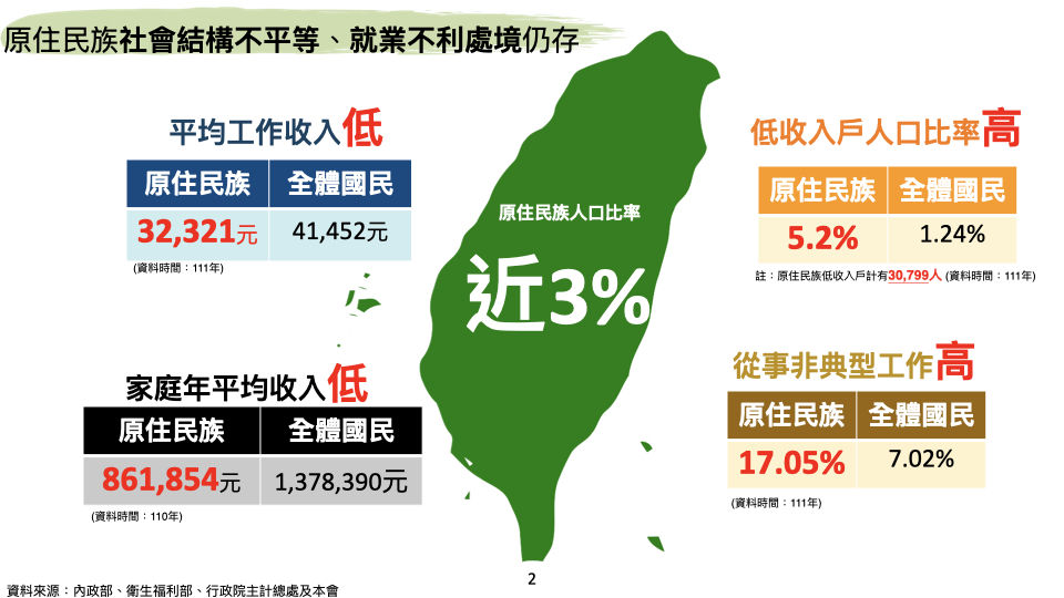 然而,原民會表示,原住民族平均每月工作收入仍低於全體民眾近1萬元,且低收入戶人口比率及從事非典型工作比率亦均高於全體民眾,顯示原住民族整體結構性社會經濟不平等地位及不利就業處境仍需改善。